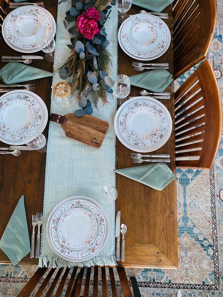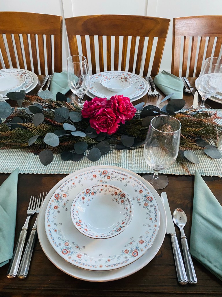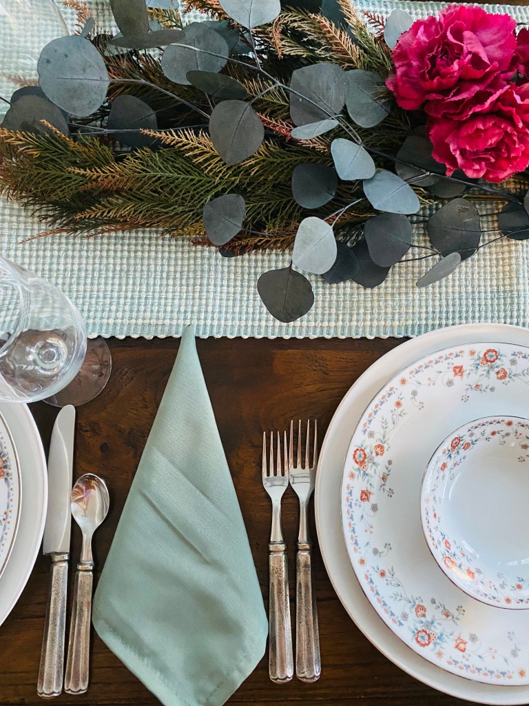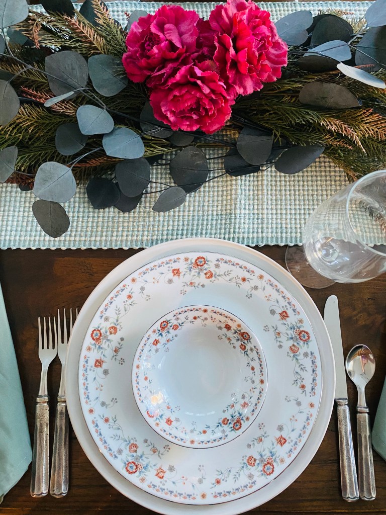 These plates have little burnt burgundy flowers with blue and green accents, so I played on those colors. I used the green as a base color with the runner and napkins, and then brought out some dark blue, burgundy, and even some deep pinks in the centerpiece. All of these florals came from Hobby Lobby!