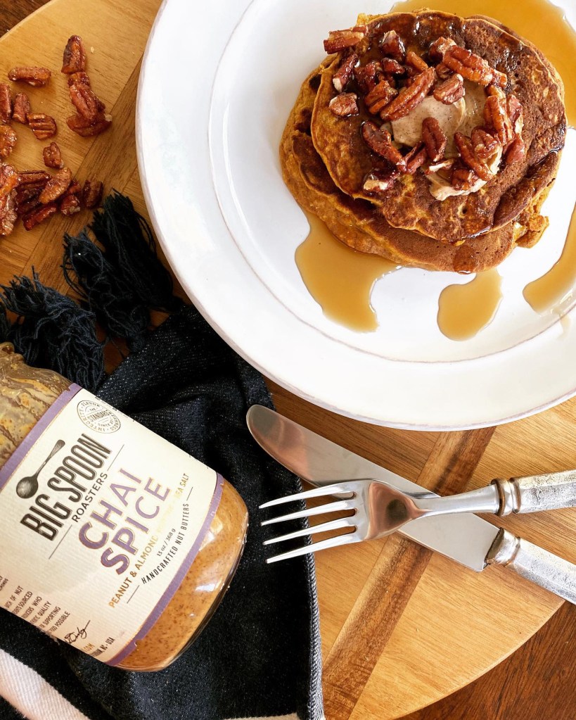 These pancakes have a secret ingredient that makes them over-the-top good: Big Spoon Roasters: Chai Spice Nut Butter. Big Spoon Roasters is a company in Durham, NC with an amazing story and crazy good products. Their nut butters are handcrafted, small batch, and ethically sourced with high quality ingredients. They’re doing it right and doing it well. Give their website a look and thank me later.