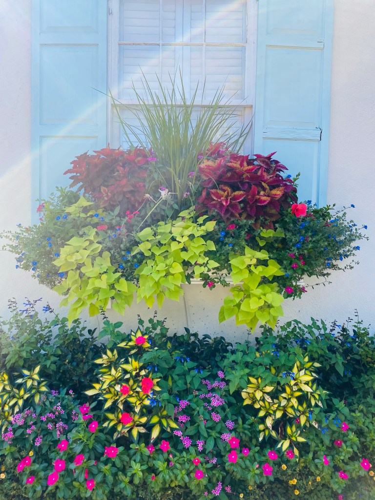 This look is so vibrant and fun! The window box below has deep, blue-grey leaves that anchor it to the color of the window box itself, but then lots of pops of color to draw your eye across the entire arrangement. It may just be my personal favorite…
