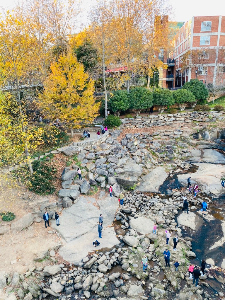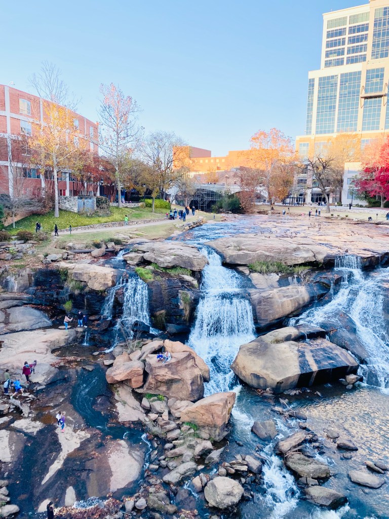 Greenville sits on both sides of a river that winds its way past hotels, restaurants, and shops before finally spilling over a huge bed of rocks and turning peacefully into a much smaller version of itself along the park.
