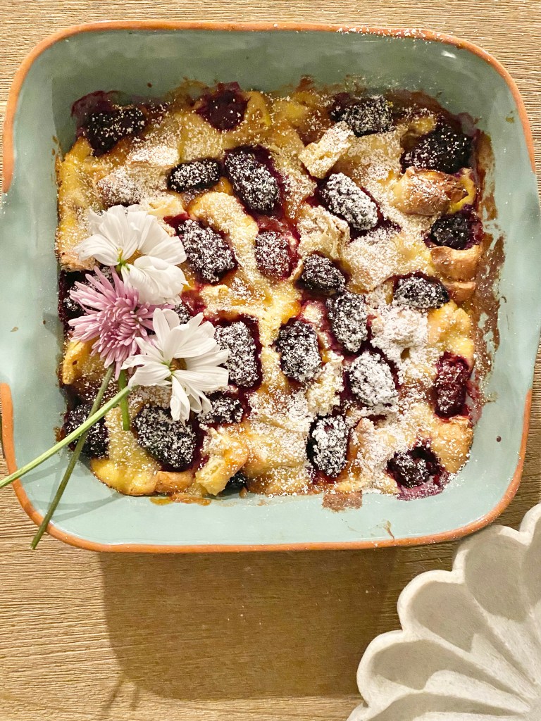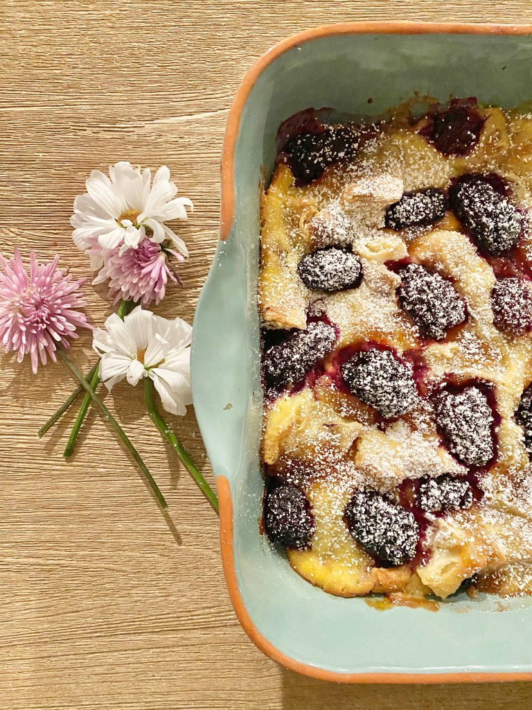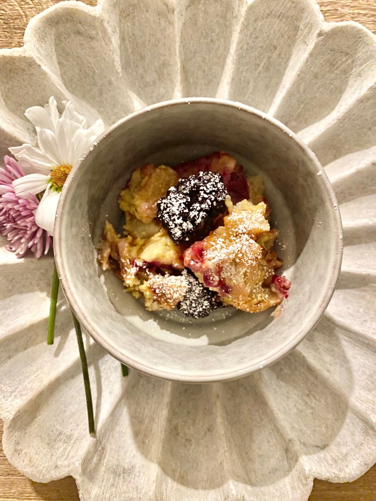 This bread pudding is so easy to make, and it’s the perfect balance of warm comfort and bright, bursting fruits.